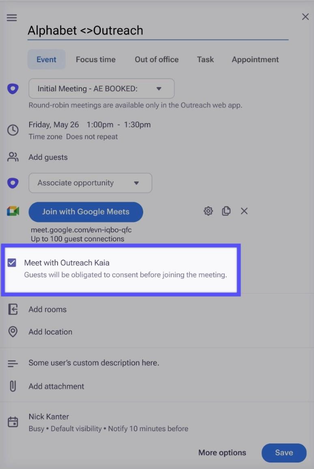 When scheduling through Google Calendar with the Outreach Everywhere extension enabled, you will receive a new option `Meet with Kaia` when adding a video conference.