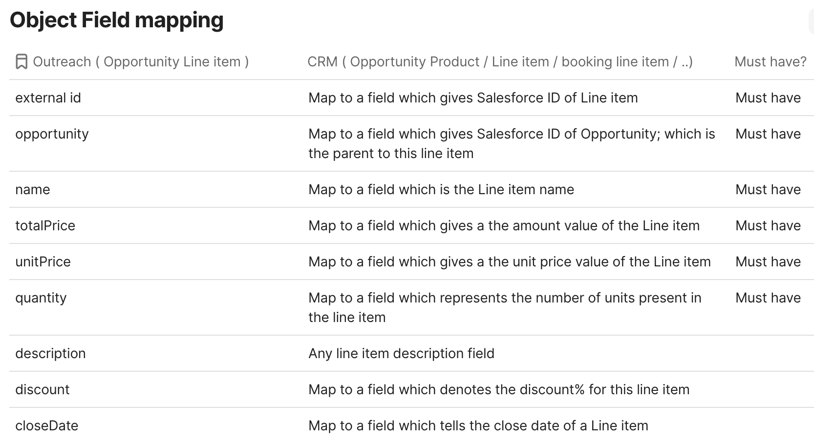 3. Complete field mapping between Salesforce and Outreach objects (e.g., external id, opportunity, name, totalPrice, unitPrice, quantity, etc.) with all must-have fields mentioned above.