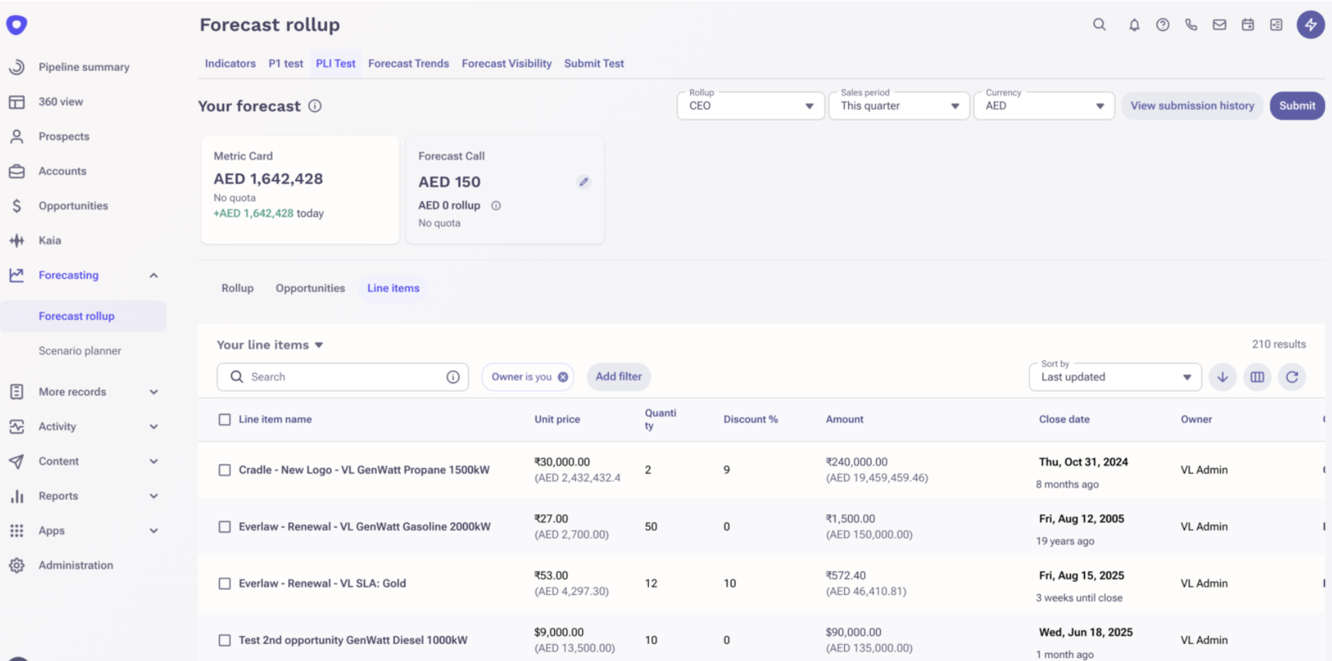 4. Review your forecasts on the Forecast Rollup page, where Line Item forecasts will appear alongside traditional Opportunity forecasts.