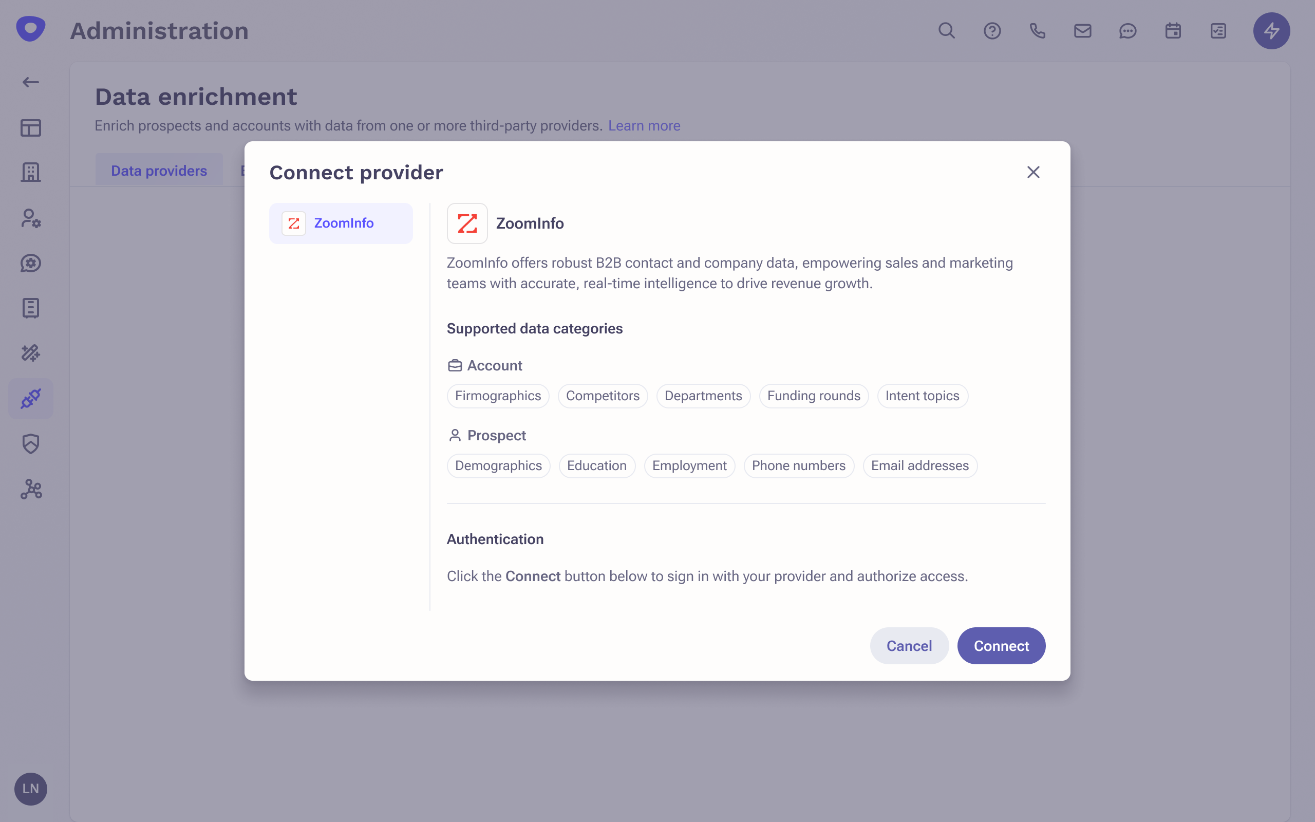 - Prerequisite: Data Enrichment must be enabled in Outreach. Admins must connect to an enrichment provider via API key or OAuth credentials.