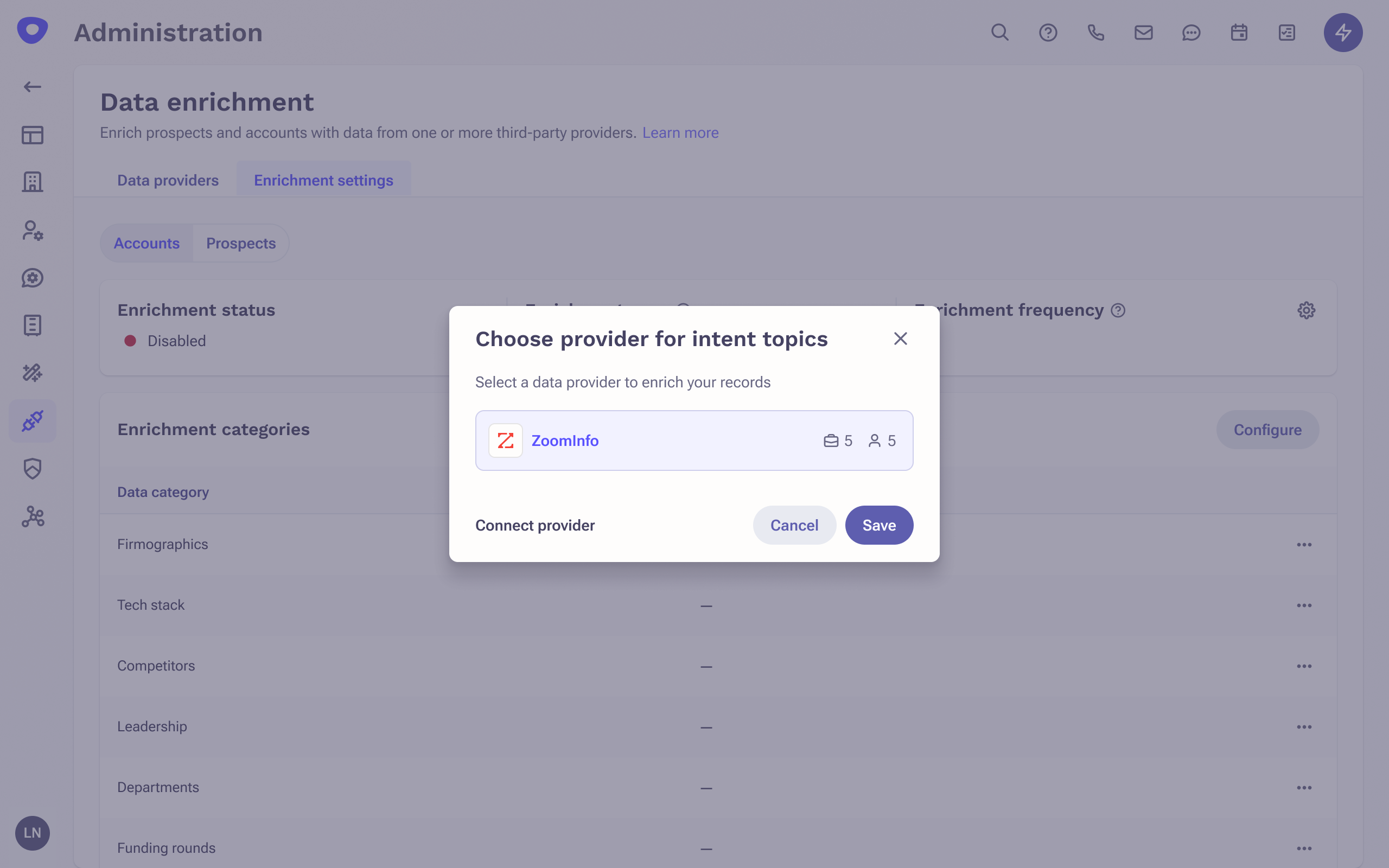 - Select a provider that supports Intent Topics (currently ZoomInfo).