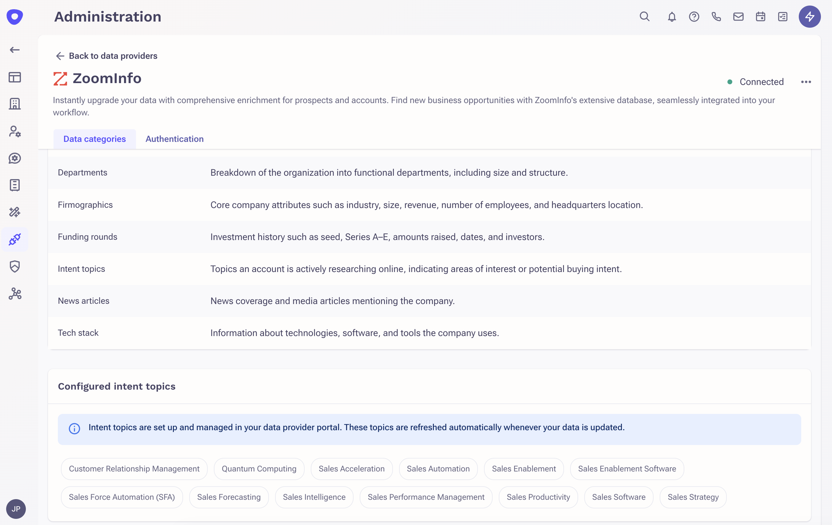 - Provider requirement: Intent Topics are currently supported through ZoomInfo. Support for additional providers will be added in the future.