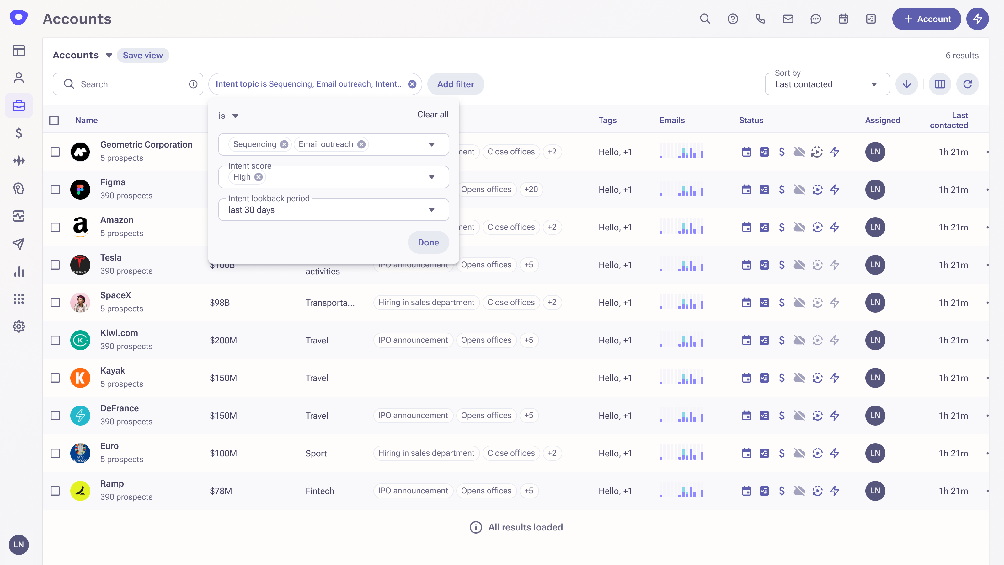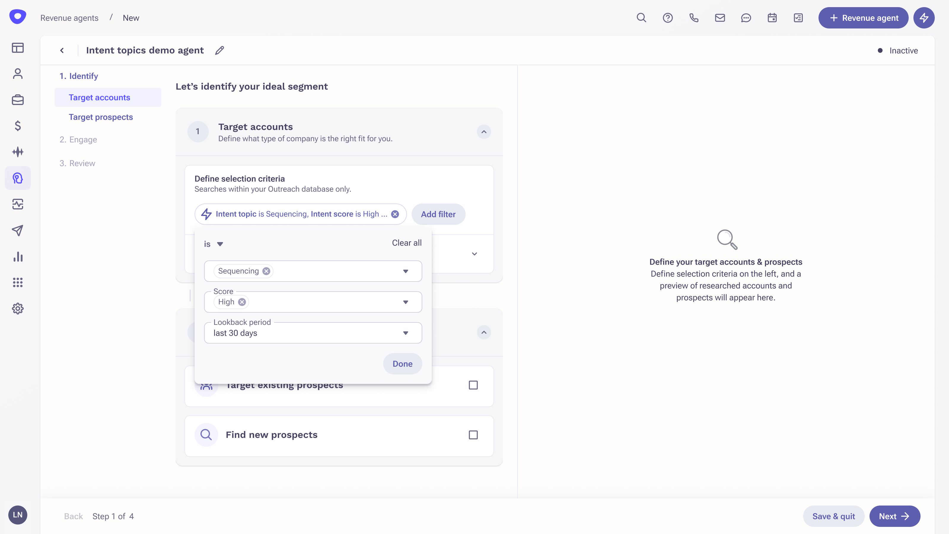 Example: If an account shows high intent for “AI Sales Tools” within the past 30 days, search for relevant prospects within the account and them to a corresponding sequence.