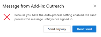 Message from Add-in: Outreach - Because you have the Auto-process setting enabled, we can't process this message until you've signed in.