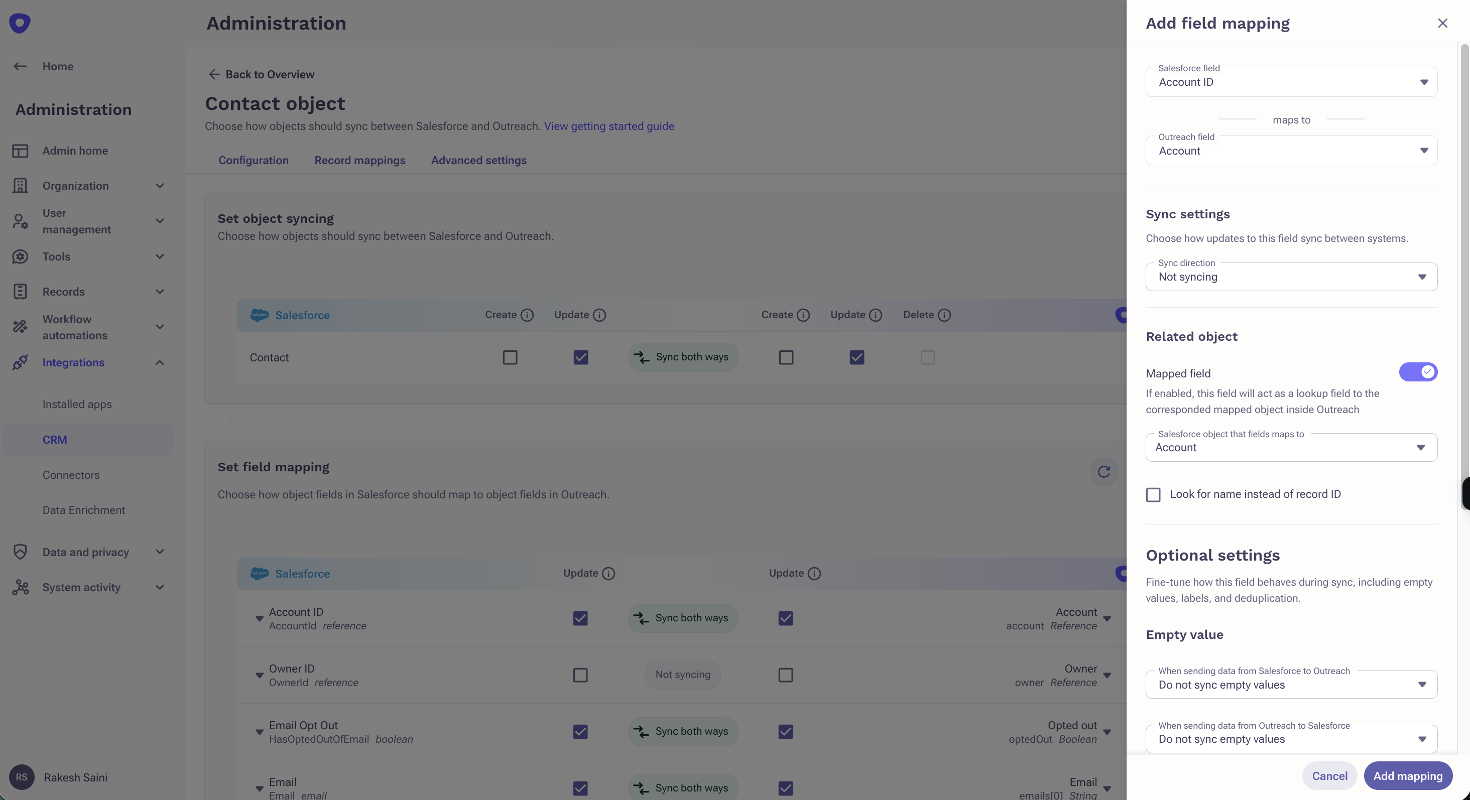 The new Add field mapping experience enhances the quality of data sync with Outreach and CRMs by doing upfront validation of sync configuration at the time of setup.