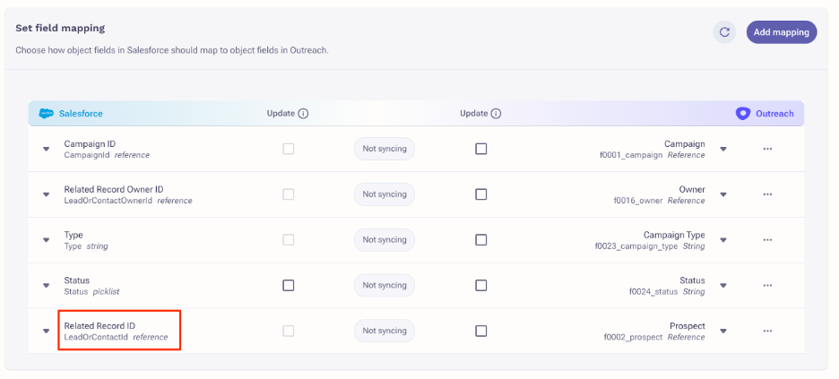 • Example: In Salesforce, a Campaign Member record can reference either a LeadID or a ContactID. Using polymorphic field mapping, both IDs can be mapped through the Related Record ID field to a single Prospect lookup in Outreach. During sync, Outreach will populate the lookup with whichever value is available first.
