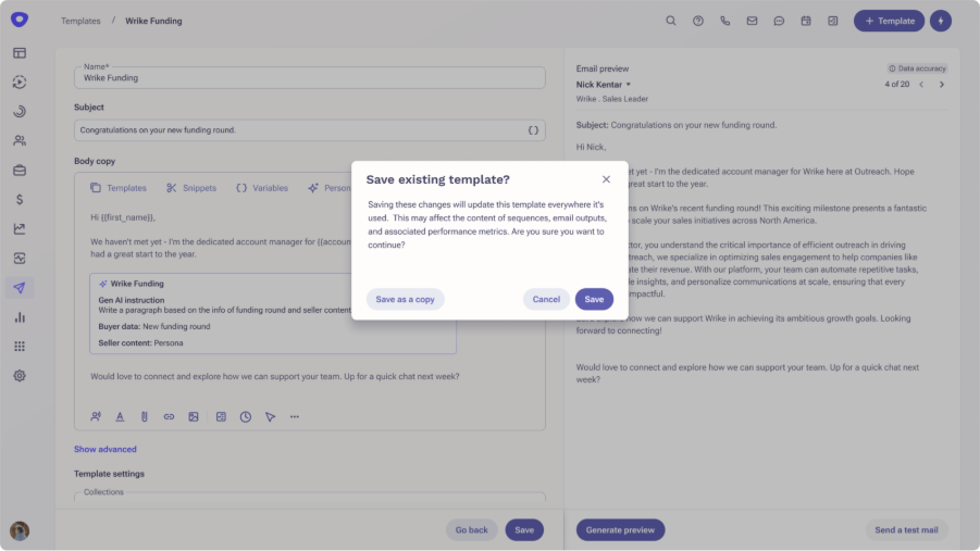 - When a user attempts to edit an already-used Template or Sequence step (with delivered emails), Outreach will prompt them to: