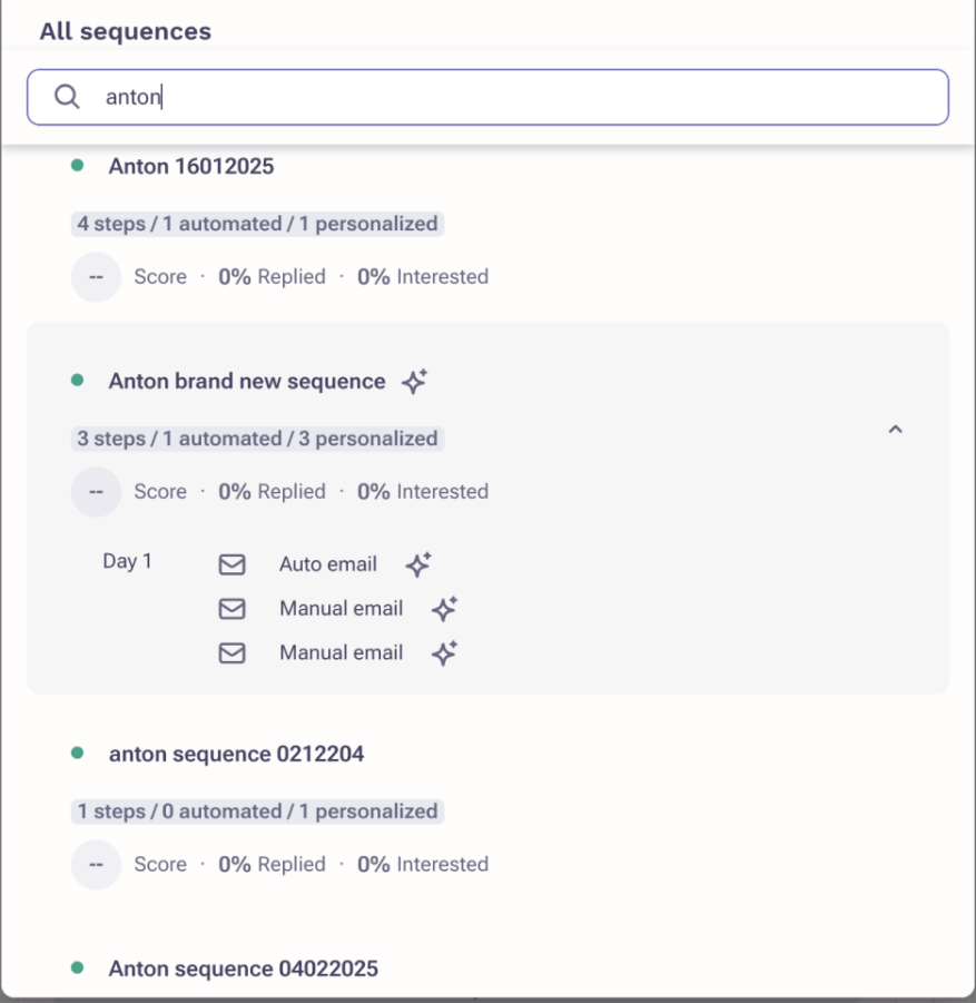- When choosing templates or sequences (e.g., in triggers or bulk actions), users can now see which items include AI content.