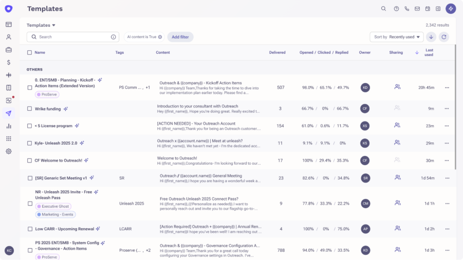- Apply the AI Content Filter to isolate performance of AI-powered vs non-AI Templates, Sequences, and Emails.