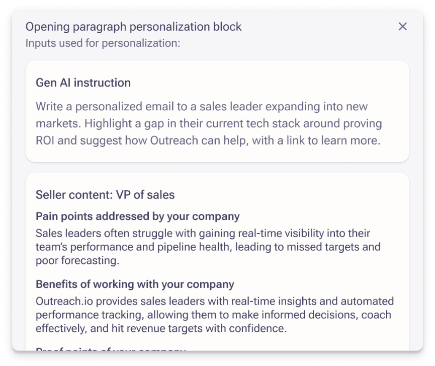 - Personalization blocks inserted into Templates or Sequences using buyer/seller data.