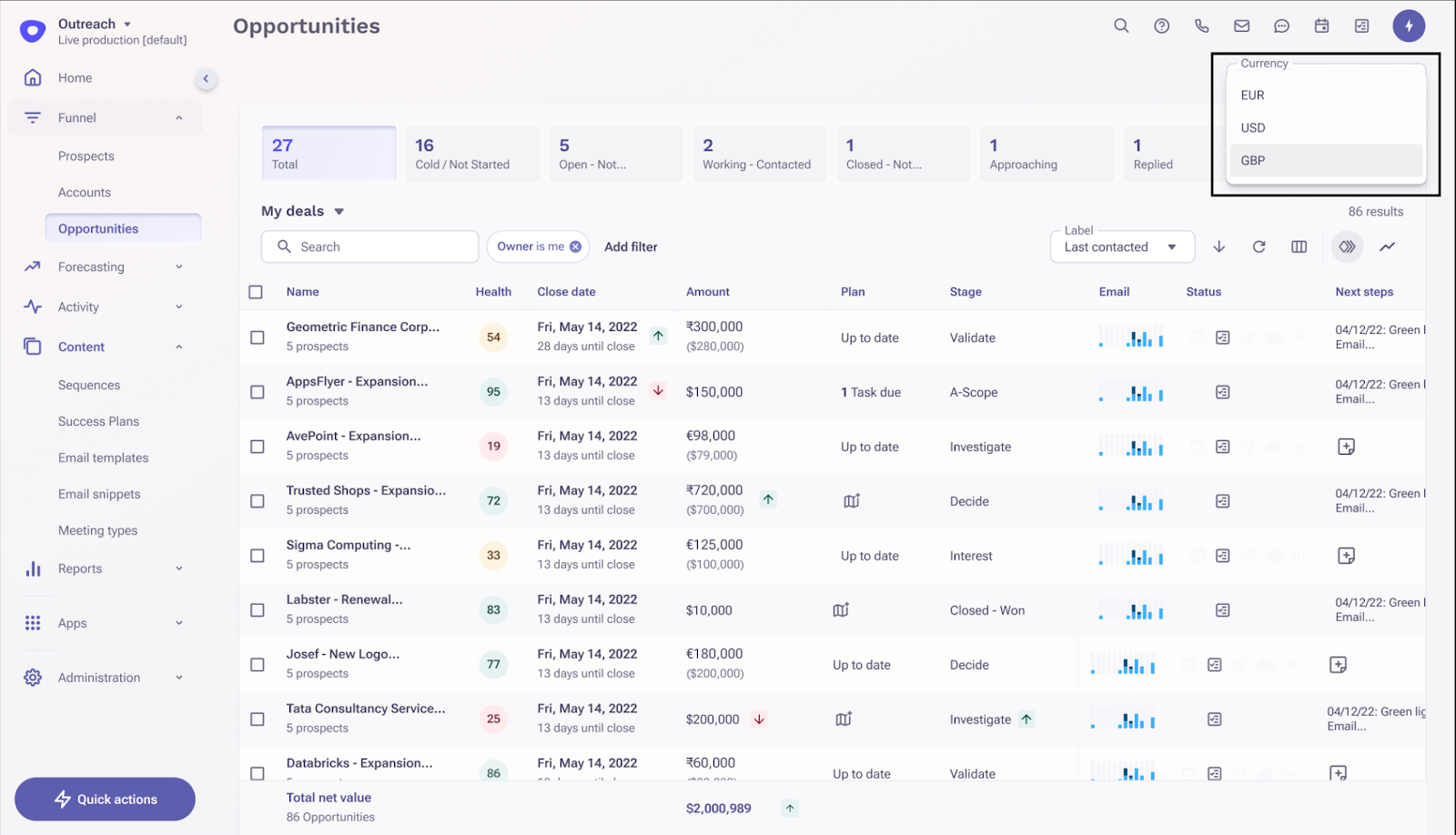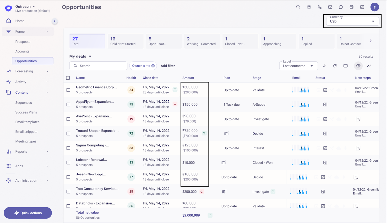 This capability aims to enable managers & AEs of such enterprise customers to utilize Outreach Opportunity list to be able to see opportunity amount in their local currency