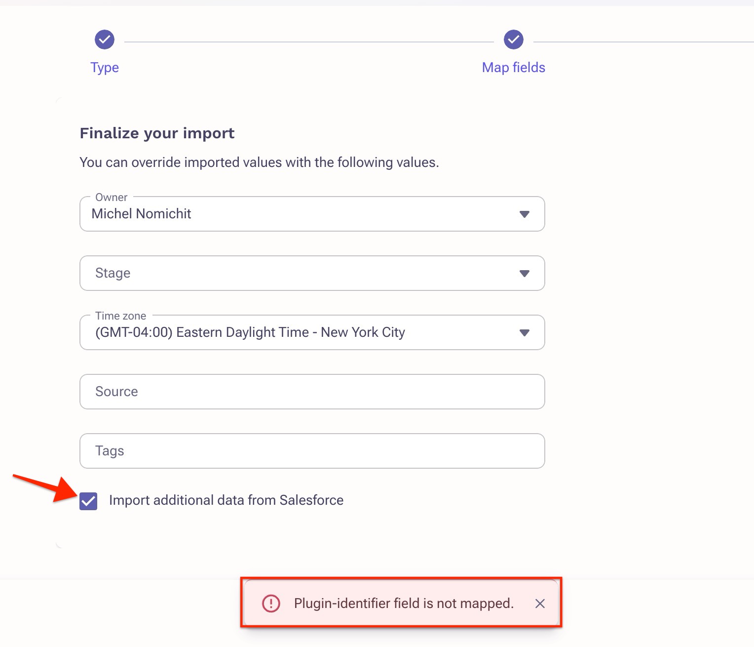If you wish to import additional information down from Salesforce for a Prospect and have included their CRM Object ID, you can click the 'Import additional data from Salesforce' checkbox to populate more data.