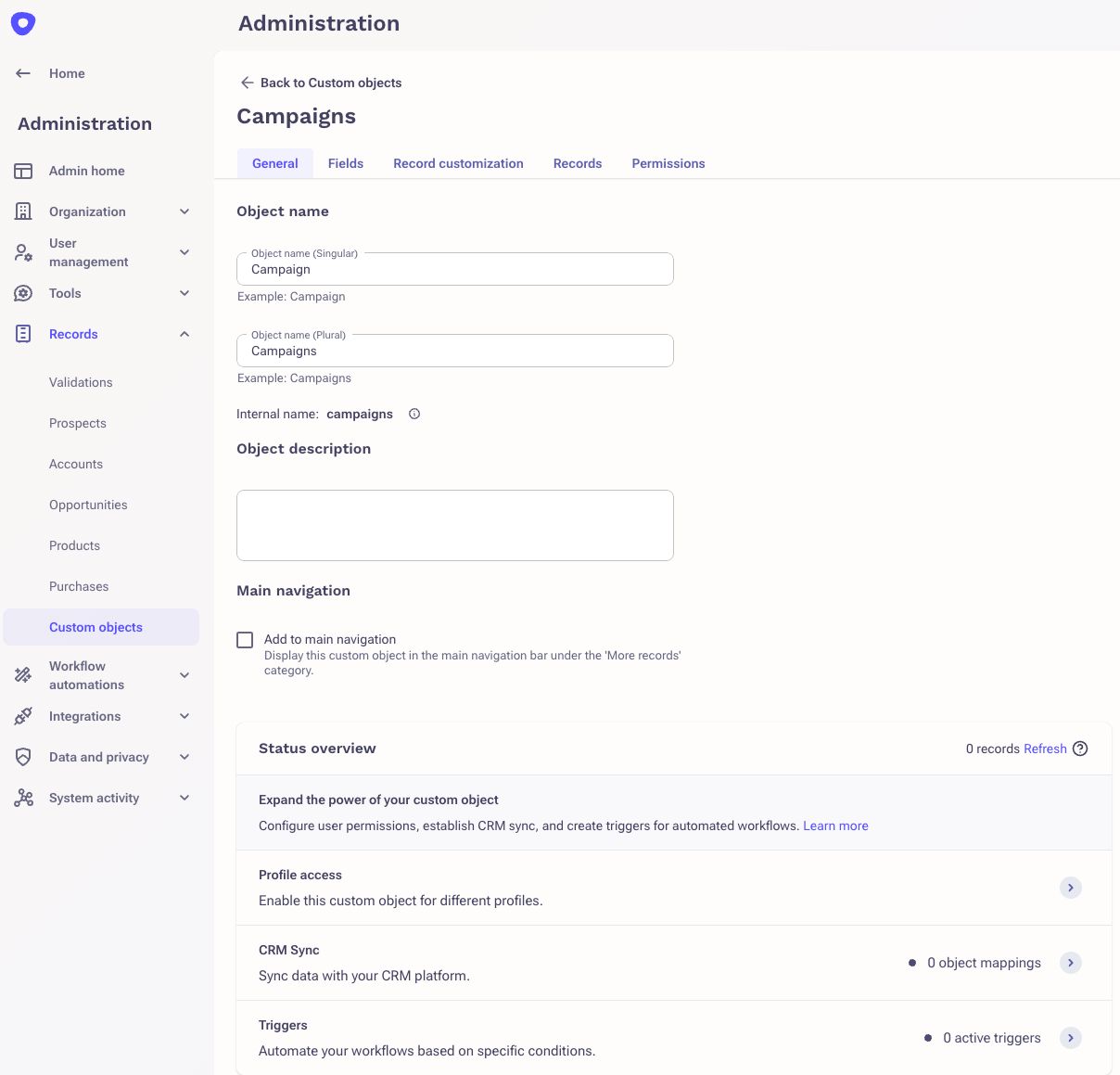 In Outreach, navigate to Administration > Records > Custom Objects.