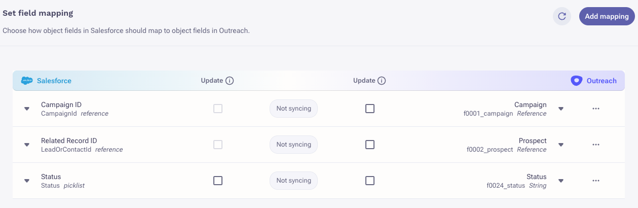 Click Add Mapping and select the corresponding field in Salesforce and in Outreach.