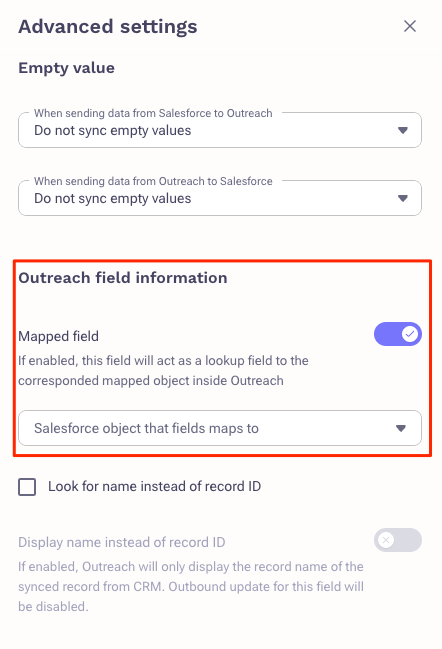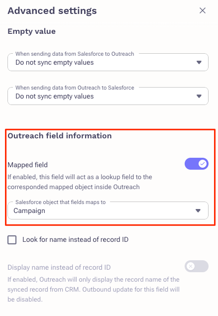 Click Add Mapping and select the 'Campaign ID' field on the Salesforce side and the 'Campaign' lookup field on the Outreach side (or however you named your Campaign field).