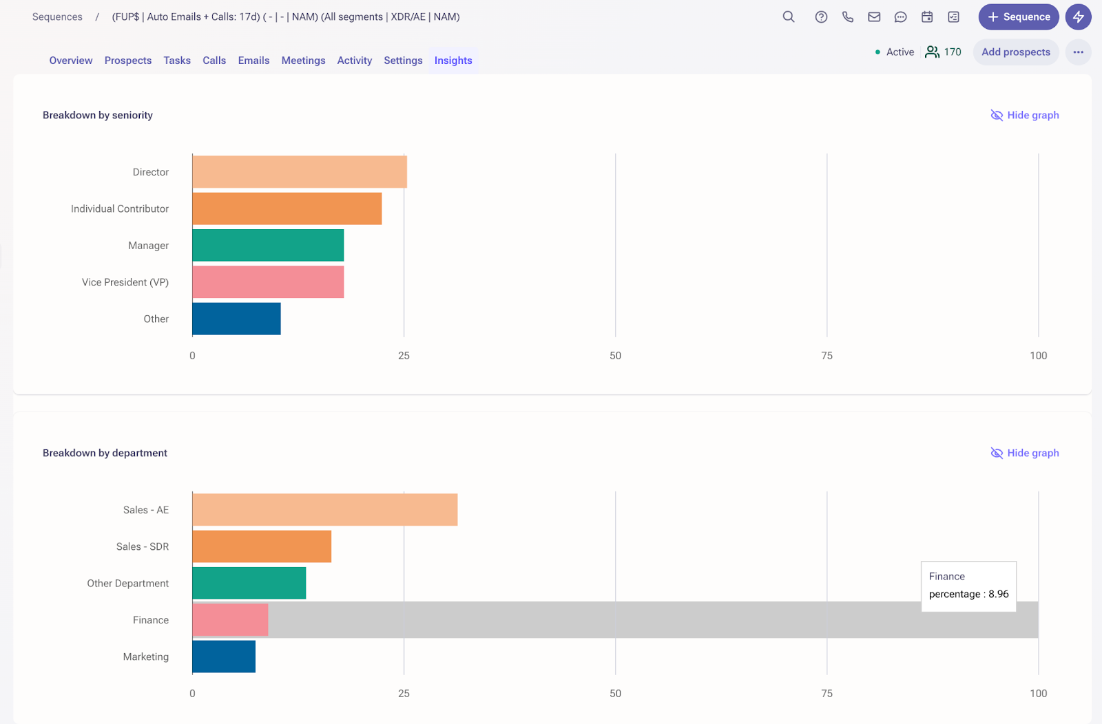 The insights tab of an individual sequence now displays two new graphs that detail sequence engagement by department and by seniority.