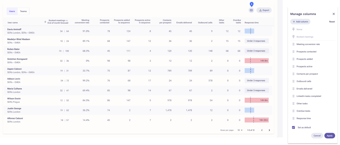 The Team & Sequence Performance Reports now have column customization with the ability to save the customization as default. Now you can view the metrics that matter the most to you and your organization or remove metrics you don't track and save those views for easy access.