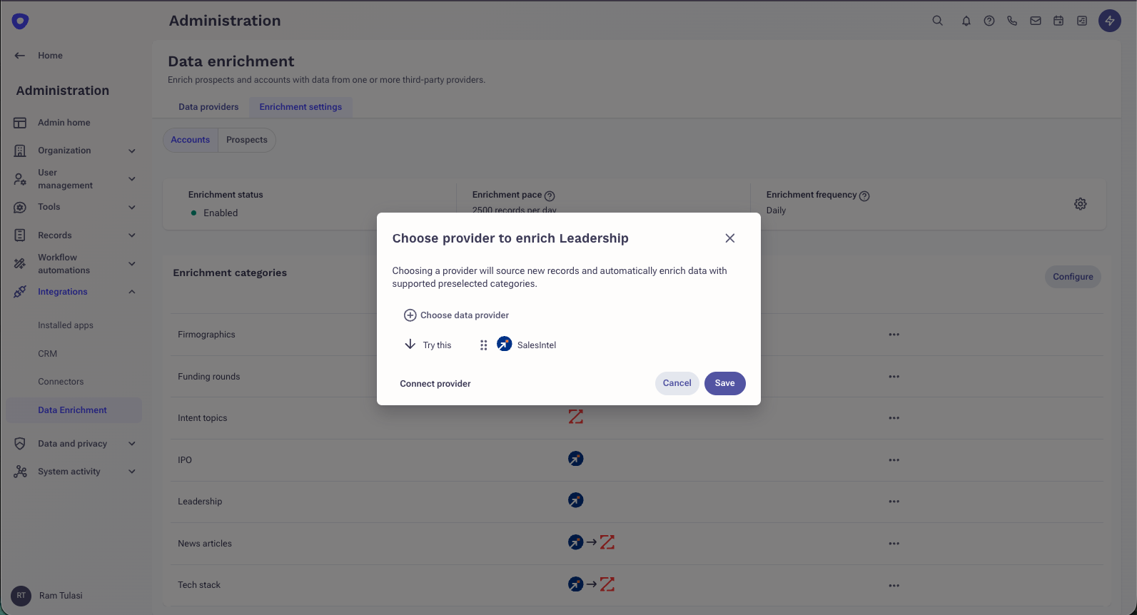 Navigate to Administration > Integrations > Data Enrichment > Connect Provider.