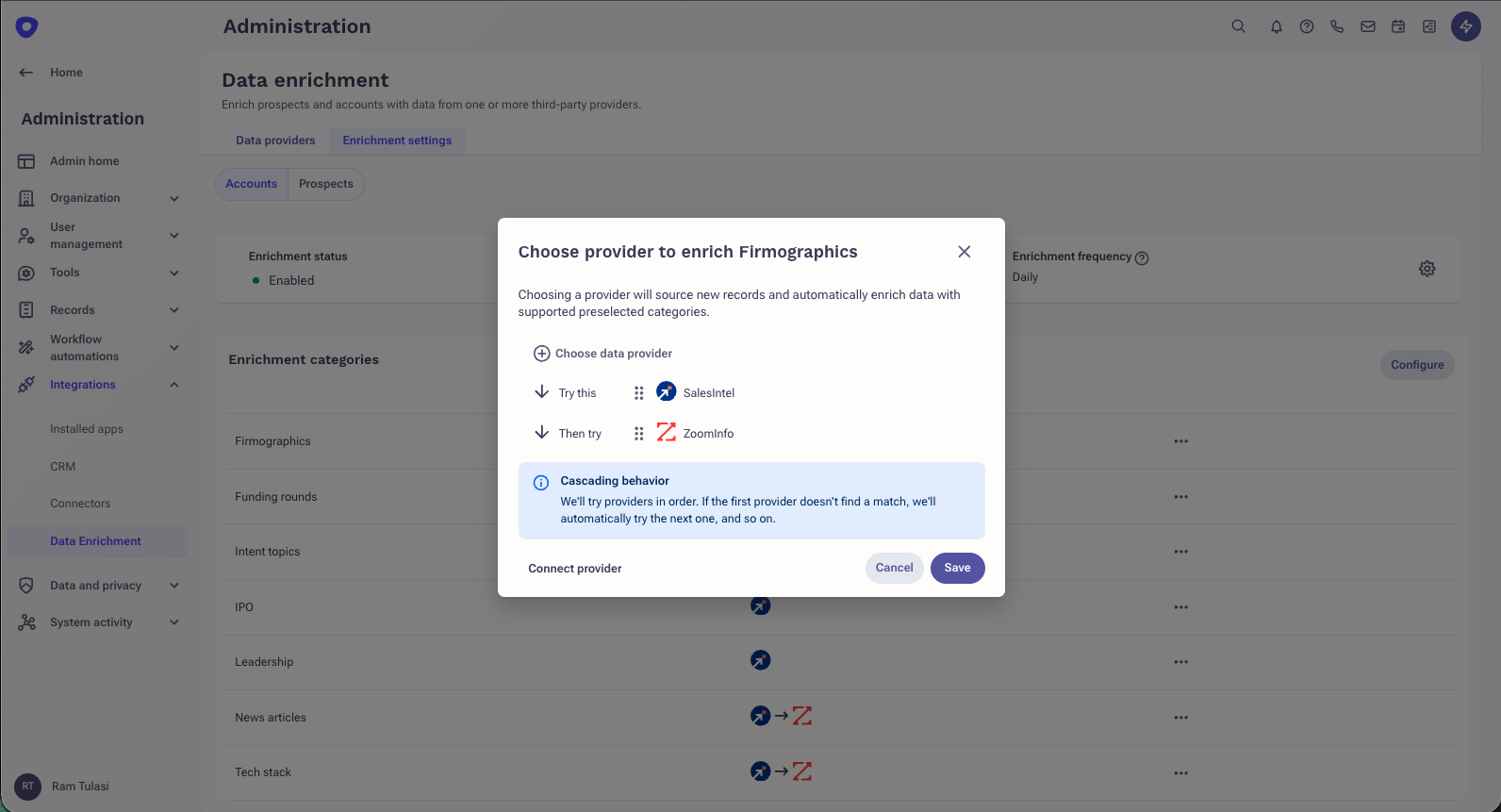 Admins with access to multiple data providers can assign individual data categories to the providers of their choice. In addition, they can define the cascading order of enrichment by ranking them in order.
