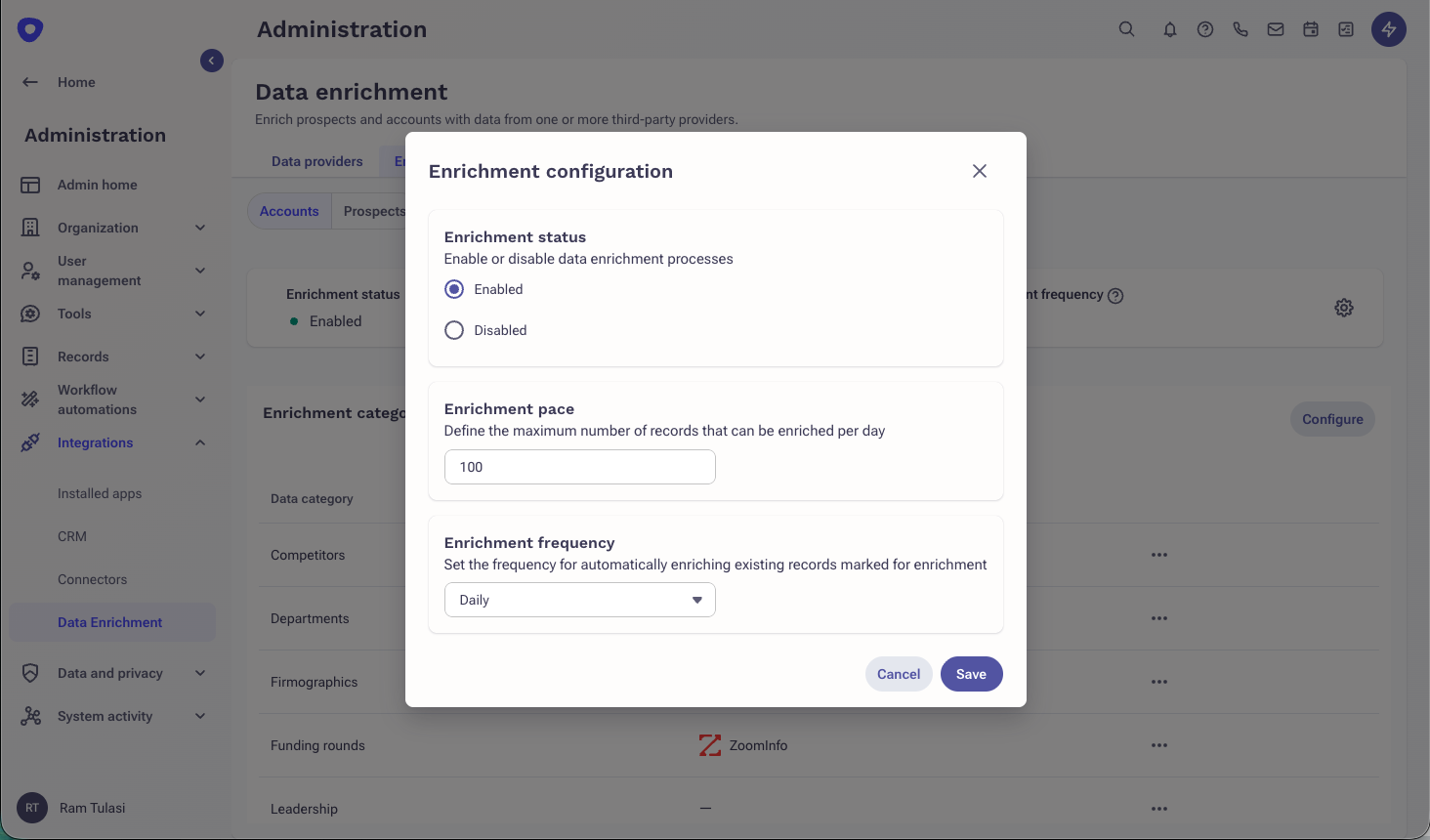 Go to Administration > Integrations > Data Enrichment > Enrichment Settings