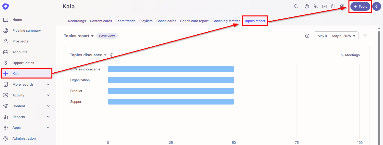 The Topics report (Kaia > Topics report tab) is where you can see the data and trends for your Smart Topics. Analyze how often they appear and potentially correlate with deal stages or outcomes (depending on your org’s reporting capabilities).