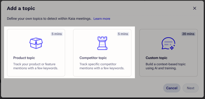 - In the Add a topic window, select either Product topic or Competitor topic, as applicable.