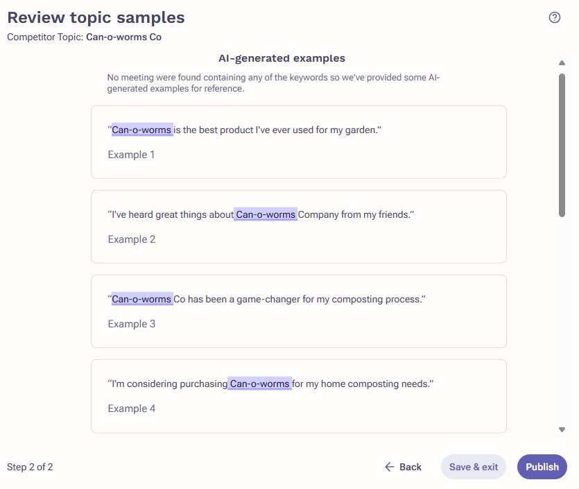 - If the topic and keywords are for something new (like a new product), the system will present AI-generated examples for you to review.