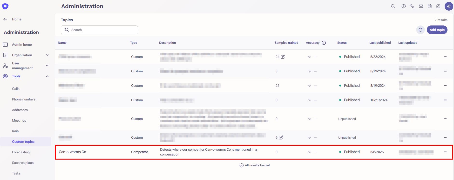 Once done, you’ll land on the Topics management page (Administration > Tools > Custom topics). From here, you can manage (edit, retrain, re-publish, remove) both Smart Topics and Custom Topics. Learn more here.
