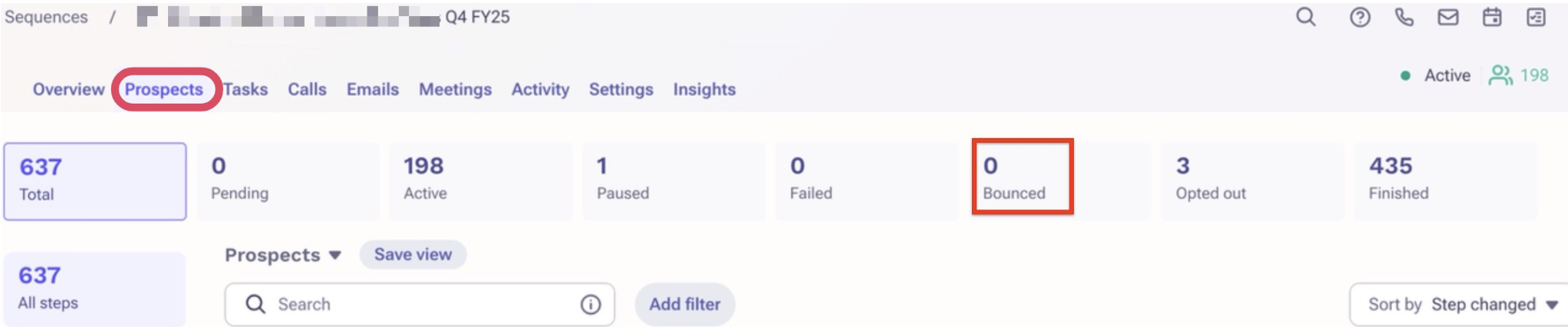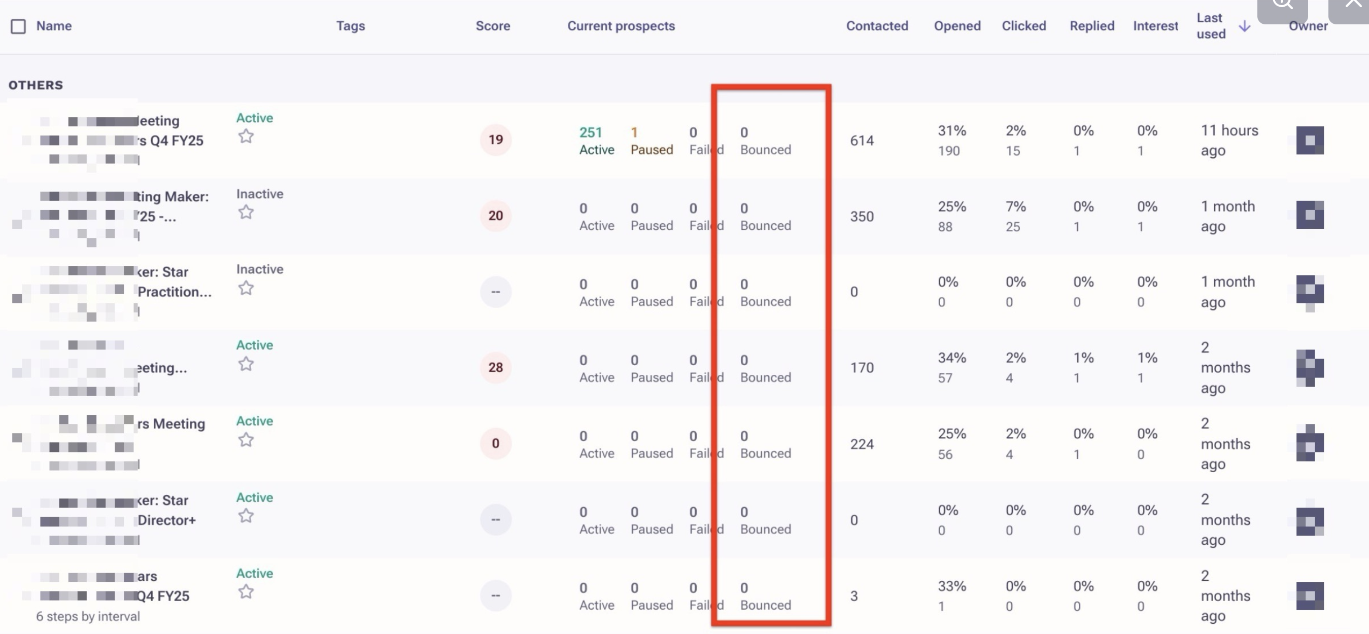 For example, when we assign a prospect to the sequence and that sequence has an email step and we send an email when time arrives. If that email bounced then the state changed to bounced and in the list view you can see bounced count increased to