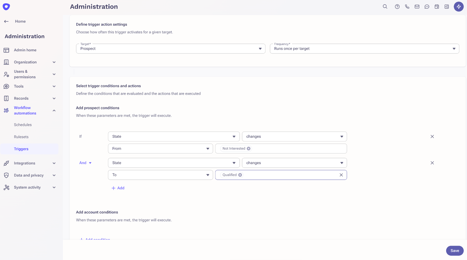 Automate workflows around prospects, accounts, and opportunities records with field-based triggers