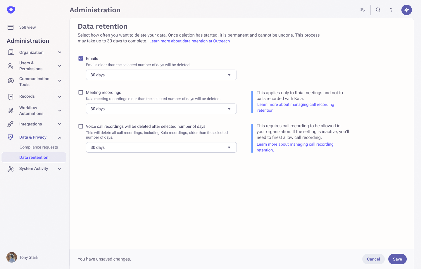 This new self-service user experience enables Outreach Admins to centralize the data retention management for Outreach emails, Kaia, and Voice.