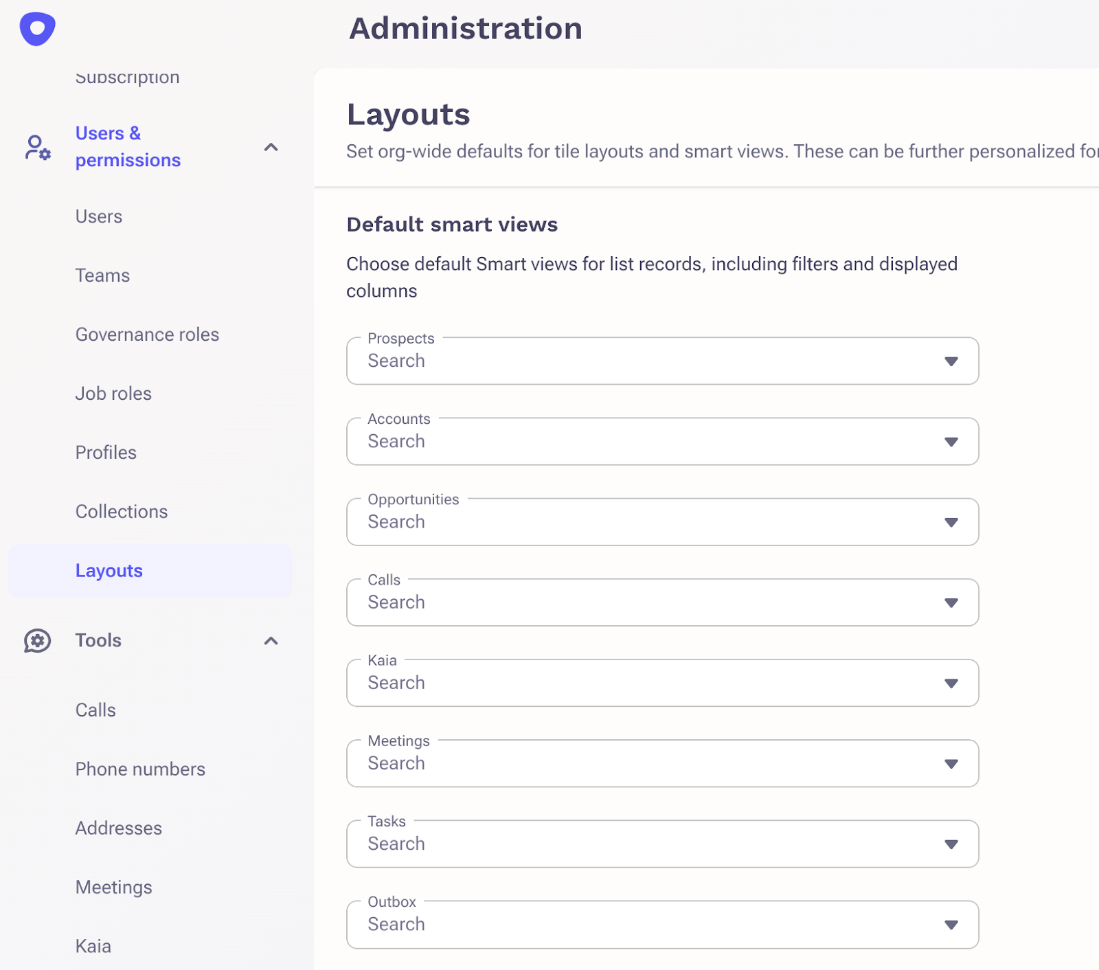 - To set up custom SmartViews visit the Layouts page in the Administration section of Outreach and select from SmartViews