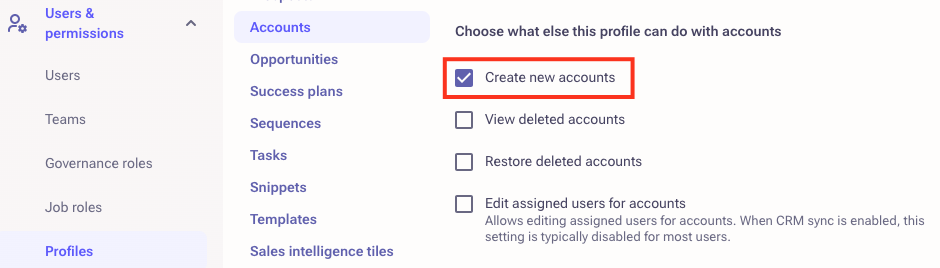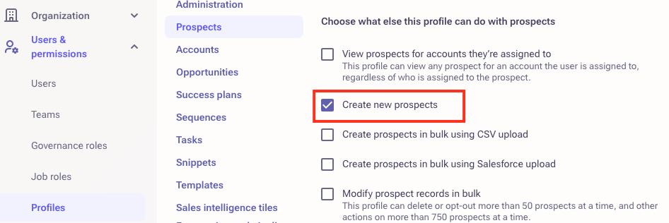 Outreach Admins will now be able to control who from their organization will be able to create Prospects and Accounts in Outreach. This measure will guarantee that only designated profiles with responsibility for this task will possess access to execute it.
