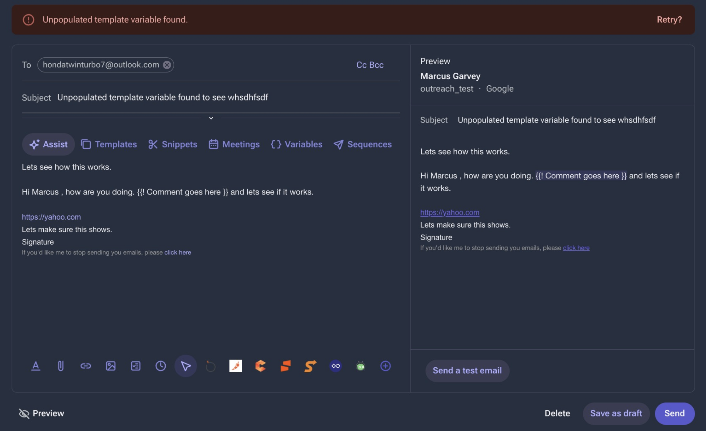 The {{! Comment goes here }} Variable has been used on the email template, but no data/ comment has been entered for this variable.