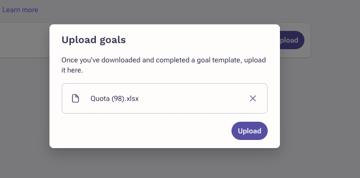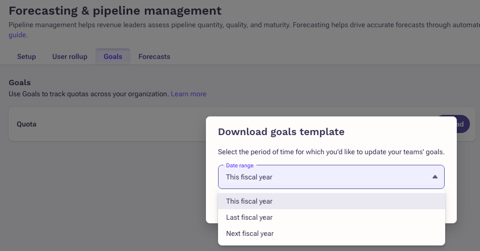 Download the Quota Excel file that you will use to populate and load your organization’s quota goals. Once you click on Download template, choose the time period for which you would like to set goals (i.e., Last Fiscal Year, This Fiscal Year, or Next Fiscal Year).