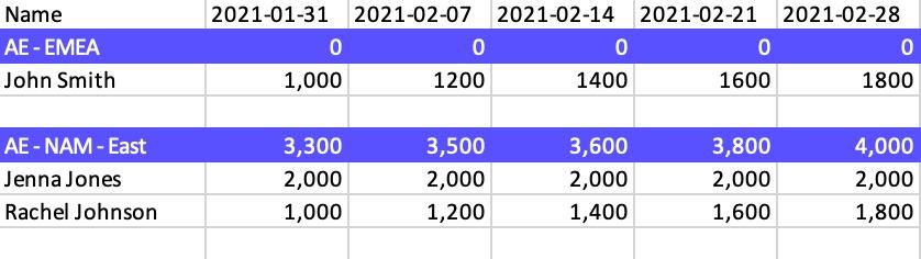 - In the example spreadsheet below, the quota for the “AE - EMEA” group would simply be equal to John Smith’s quota goals. However, the quota for the “AE - NAM - East” group would reflect the value displayed in the passion blue cell ($3,300 for the first week) rather than the sum of Jenna & Rachel’s quotas.
