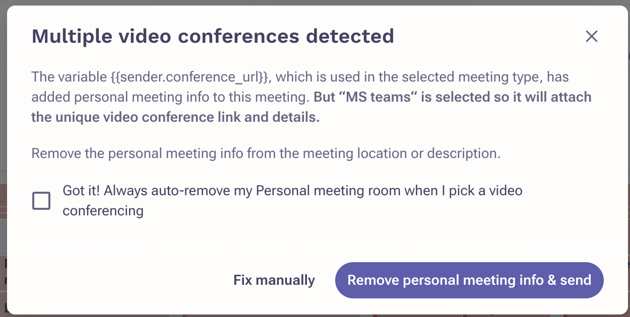 A: This dialog prevents sending the meeting invites with multiple different meeting links. To prevent the display of this warning message, you can opt to select the "Got it! Always auto-remove my Personal meeting room when I pick a video conferencing." option. This action will result in the automatic removal of static meeting variables from meeting invitations, ensuring the consistent utilization of the Zoom link integrated by default.