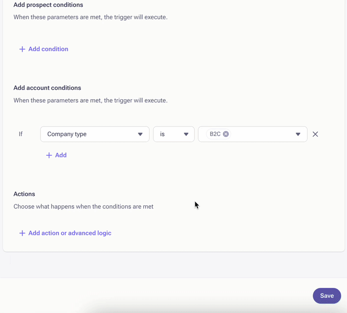 - Set up any common conditions that must be met irrespective of the branching conditions. In this case, the Account must be in the ‘Finserv’ industry and the Prospect must be a ‘Decision maker’.