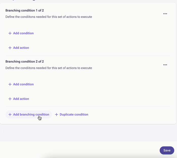 Admins can create branching conditions linked to specific actions. Once set up, the trigger will fire the action associated with the branch, only when the condition associated with that specific branch is met.