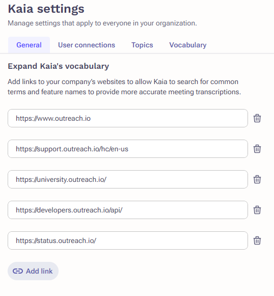 By including your company URL, Outreach Kaia can search your website for commonly used words, integrations, products, and competitors and train our AI based on these words. This results in more accurate transcriptions of your calls.
