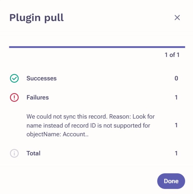 When attempting to pull from the Salesforce, the error "We could not sync this record. Reason: Look for name instead of record ID is not supported for objectName: _______" appears (example below).