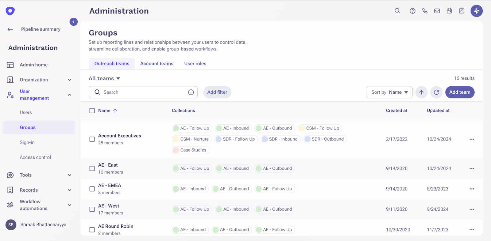 The new Groups page is where you can go to manage all your Outreach Teams and Account Teams (if you use the Team Selling via Account Teams feature)