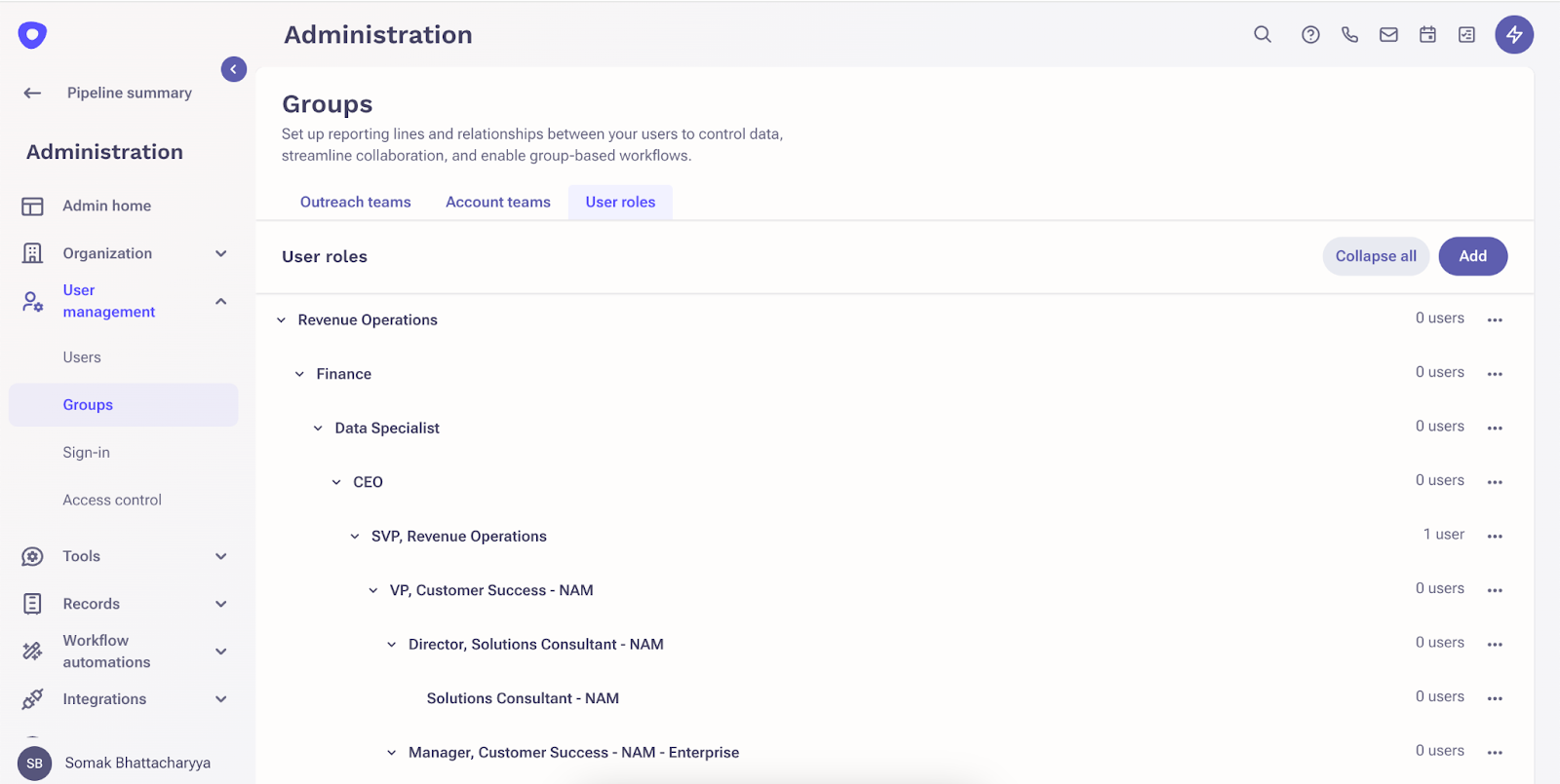 All of your existing Outreach Teams will show up here. If you are using Team Selling with Salesforce Account Teams, they will also show up here as a separate tab. As part of this change, the User Roles has also moved to this section. There’s no change in functionality.
