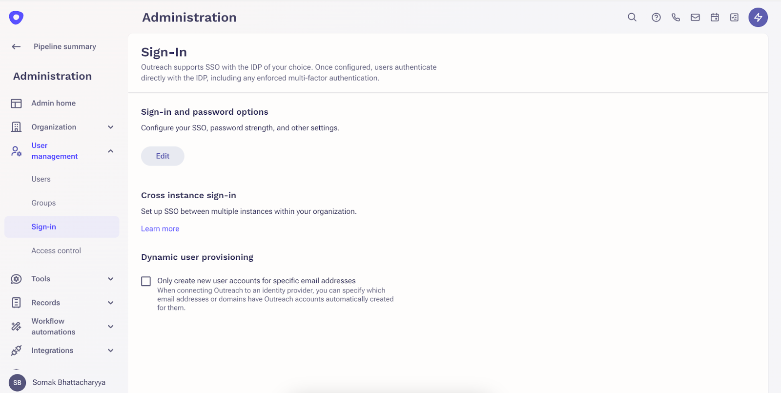For customers that can, Outreach recommends Single Sign On experience. Additionally, you can manage your Cross-Instance sign in and set up Dynamic Provisioning of users.