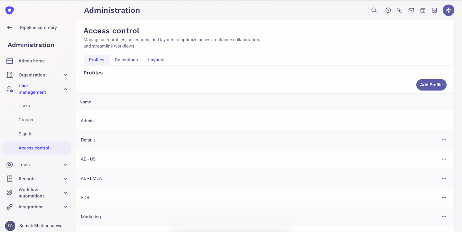 The Access control page is where you can go to manage your Profiles, Collections and Layouts. You can add descriptions to your Profiles.