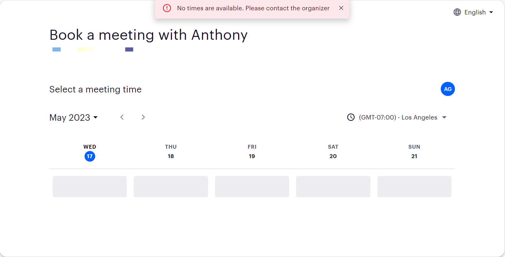 When prospects attempt to book a meeting from a user's public calendar URL and are seeing the "No times are available. Please contact the organizer" error.