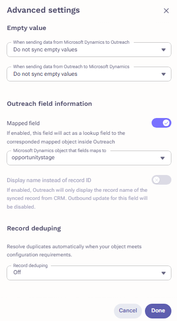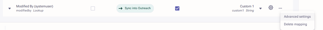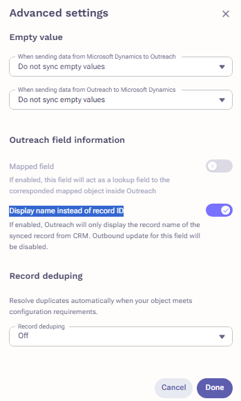 Custom Outreach Field: If you are mapping a CRM lookup field to a Custom Outreach field, you need to enable Display name instead of record ID in Advanced field settings.