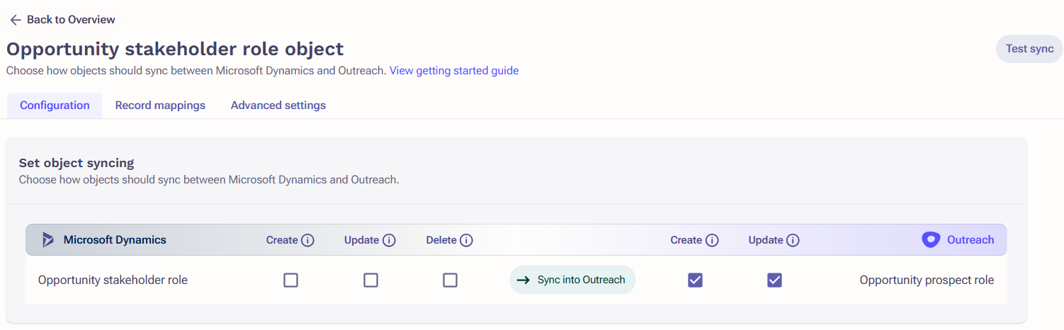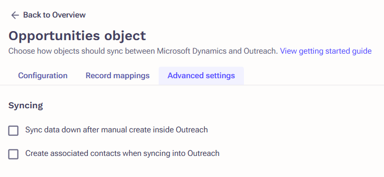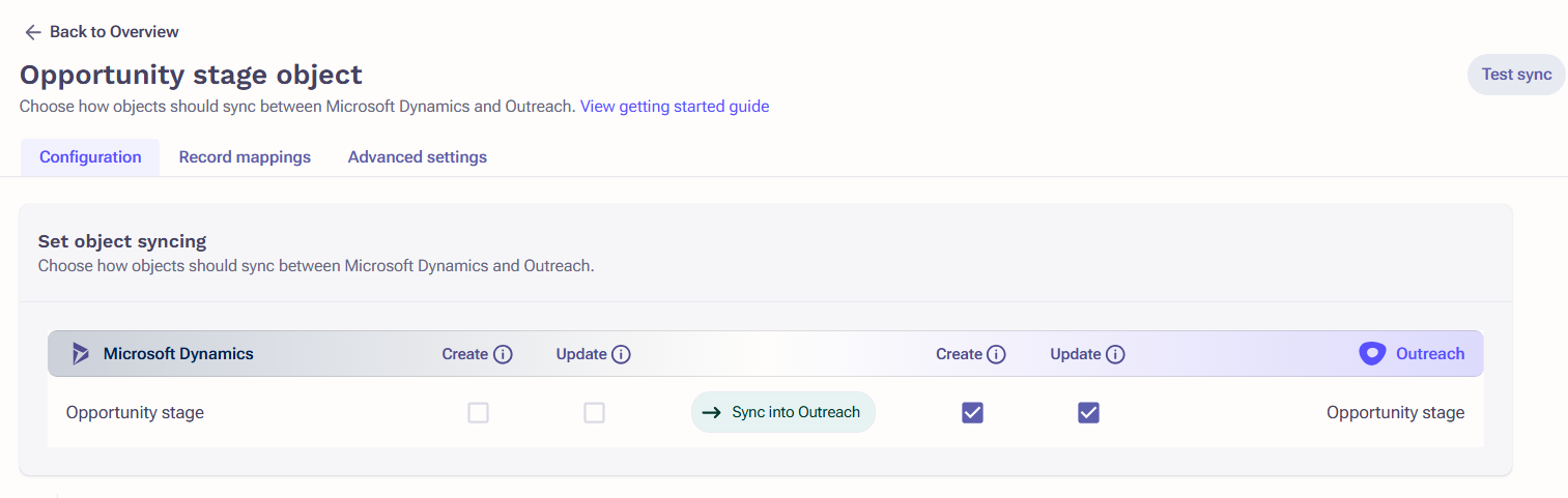 - Set object syncing: Create & Update enabled to Sync into Outreach