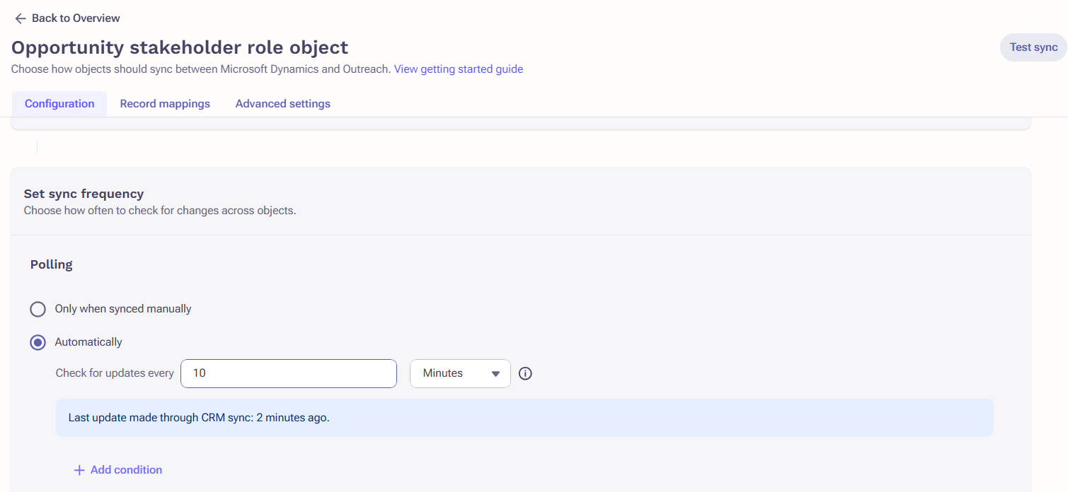 - The Opportunity Stakeholder Role object being enabled to Poll automatically and create new contact roles will allow Outreach to pull in the related Contact roles independently when they are added to the Opportunity in Dynamics as a Stakeholder and/or modified.