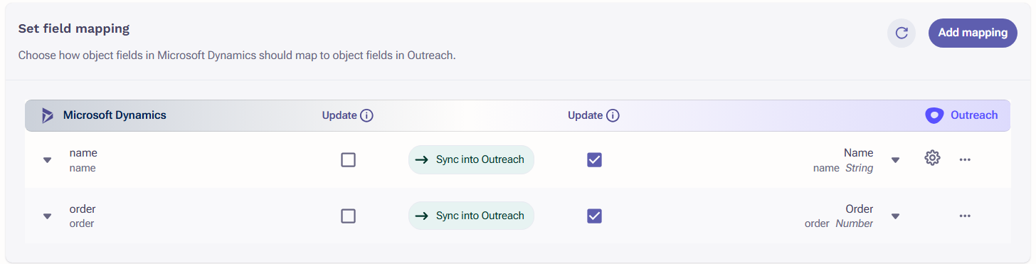 | Dynamics Field (Labels may vary in your CRM) | Outreach Field | Field Type |